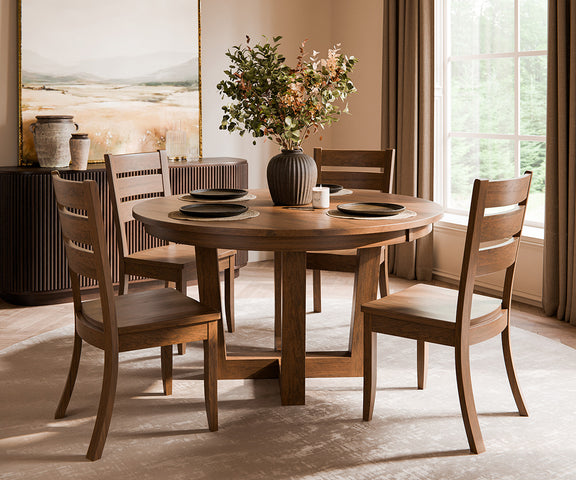 The Amish Portland Single Pedestal Table blends timeless design with expert Amish craftsmanship. Its sturdy pedestal base and round tabletop make it a perfect choice for both cozy kitchens and elegant dining rooms. Built from solid Sap Cherry and finished in a warm Sandstone stain, this table is as durable as it is beautiful. The smooth equalizer slides and optional butterfly leaf provide effortless expansion for family gatherings and special occasions.